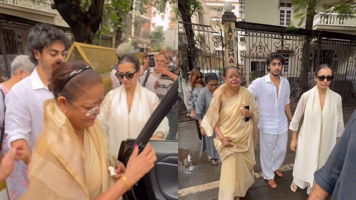 Malaika Arora's stepfather Anil Mehta's funeral took place in Mumbai on Thursday (September 12). Malaika, along with her mother Joyce Polycarp and son Arhaan Khan, was seen leaving their Bandra residence to pay their last respects to Mehta. Several heartbreaking photos and videos of the family have surfaced on social media.