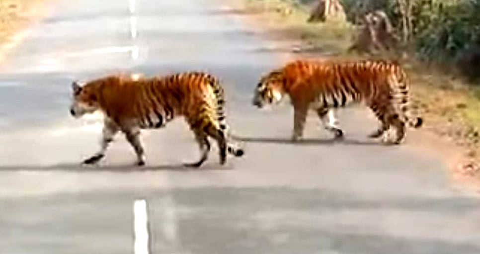 The video of both the big cats crossing the road was filmed by retired forest officer R.K. Dixit, who posted it on his social media account. While District Forest Officer Lokpriya Bharti said that he was not aware of any such incident, he assured that as of now, there are abundant water sources in the jungle, hence, the tigers are likely remaining inside and not venturing out.