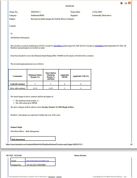 ICCL has raised the minimum margin requirements for all Gold and Silver derivatives. The new rates will apply from October 14, 2025, and affect all trading participants.