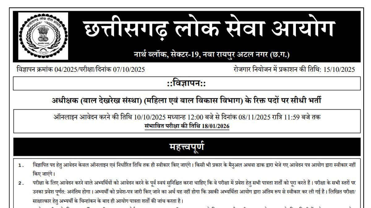 CGPSC Superintendent Notification 2025: The Chhattisgarh Public Service Commission (CGPSC) has released an official notification for the position of Superintendent (Women and Child Development Department) 2025. Once the registration window is opened, eligible applicants can apply through the official website of CGPSC at psc.cg.gov.in.