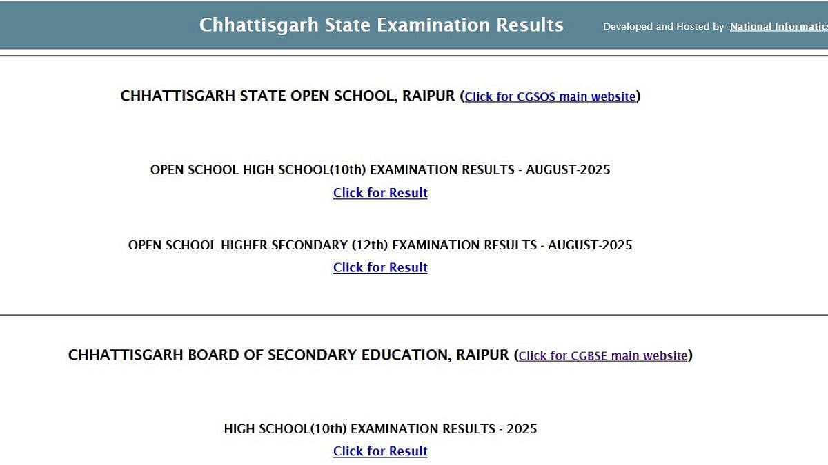 CGSOS Open School Result 2025: The Chhattisgarh State Open School (CGSOS) released the Class 10 and 12 open school results 2025 on Tuesday. The students who appeared in the exams can view their pass status online at sos.cg.nic.in or results.cg.nic.in by using login credentials.