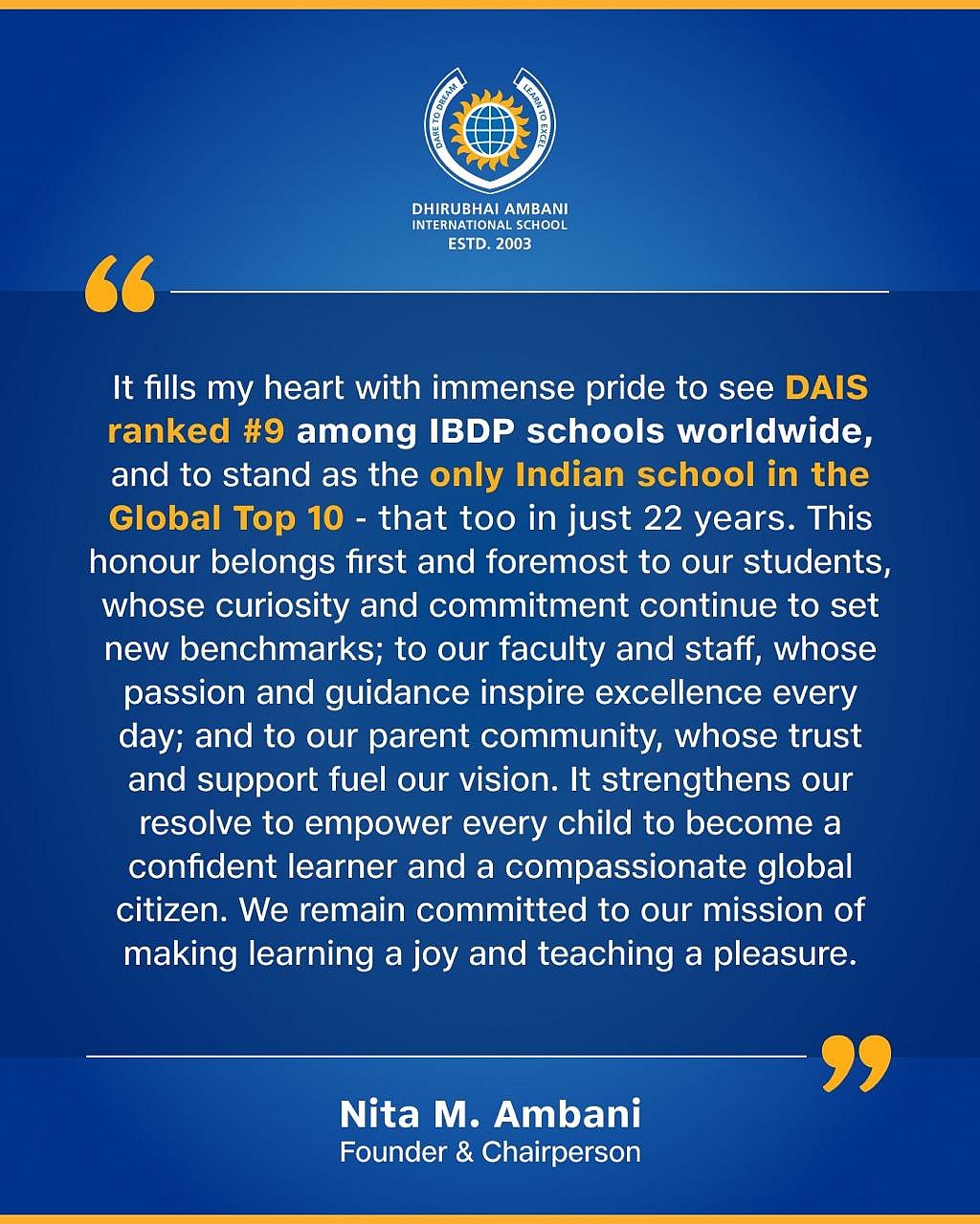 Speaking on this achievement, Mrs. Nita Ambani, Founder & Chairperson of DAIS, said: “It fills my heart with immense pride to see DAIS ranked #9 among IBDP schools worldwide, and to stand as the only Indian school in the Global Top 10 – that too in just 22 years. This honour belongs first and foremost to our students, whose curiosity and commitment continue to set new benchmarks; to our faculty and staff, whose passion and guidance inspire excellence every day; and to our parent community, whose trust and support fuel our vision. It strengthens our resolve to empower every child to become a confident learner and a compassionate global citizen. We remain committed to our mission of making learning a joy and teaching a pleasure.”