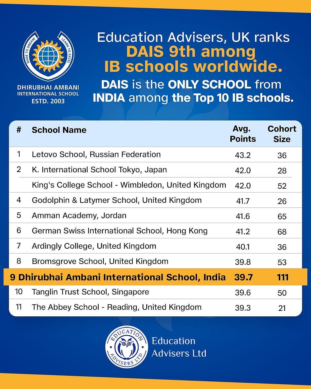 Mumbai: Dhirubhai Ambani International School (DAIS) has been ranked 9th among International Baccalaureate Diploma Programme (IBDP) schools worldwide, based on the IBDP Results 2025, in a list released by Education Advisers UK. DAIS is the only Indian school to feature in the Global Top 10 — and notably, the school has the largest IBDP cohort among all schools in the Top 10 list.