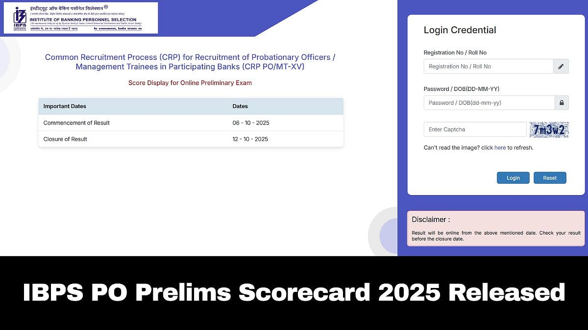 IBPS PO Prelims Scorecard 2025: The Institute of Banking Personnel Selection has announced the scorecards for the IBPS Probationary Officer (PO) Preliminary Examination 2025. Applicants who took the exam can now see and get their individual scorecards on IBPS's official website at ibps.in. As per the official update, the IBPS PO preliminary scorecard will be accessible through the website until October 12, 2025.