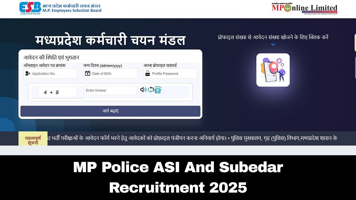MP Police ASI & Subedar Recruitment 2025: The application procedure for the 500 vacant Assistant Sub Inspector (ASI) and Subedar (Stenographer) positions in the Madhya Pradesh Police Department has started by the Madhya Pradesh Employees Selection Board (MPESB) on the official website, esb.mp.gov.in.
