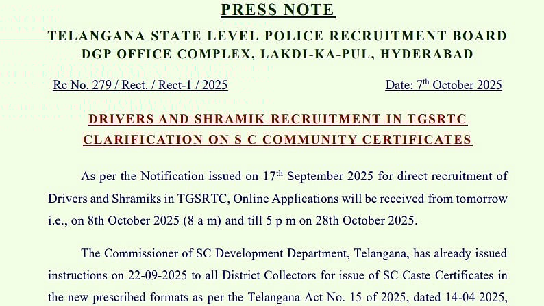 Telangana Police Recruitment 2025: Registration Opens For 1,743 Driver & Shramik Posts At tgprb.in; Check Eligibility, Fee, Selection Process