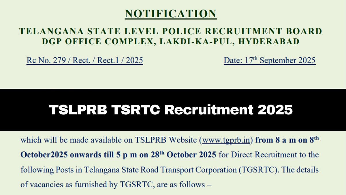 TSLPRB TSRTC Recruitment 2025: Telangana State Level Police Recruitment Board (TSLPRB) will start the application process for recruitment to the posts of Drivers and Shramiks in Telangana State Road Transport Corporation tomorrow, October 8, 2025. Those who qualify may apply for the positions on the official website at tgprb.in. Applicants can apply till October 28, 2025.