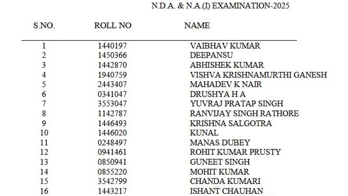 A total of 735 candidates have made it to the NDA-1 155th Course and the Indian Naval Academy (INAC) 117th Course, as per the written exam conducted on 13 April 2025 and Services Selection Board (SSB) interviews thereafter. Vaibhav Kumar has headed the merit list of NDA-1 2025. Medical examination results have not been taken into account during the final lists preparation.