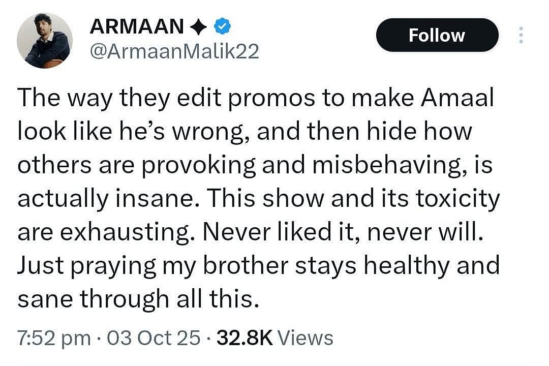 On Friday, October 3, Armaan took to his X (formerly Twitter) and wrote, “The way they edit promos to make Amaal look like he’s wrong and then hide how others are provoking and misbehaving is actually insane. This show and its toxicity are exhausting. Never liked it, never will. Just praying my brother stays healthy and sane through all this."