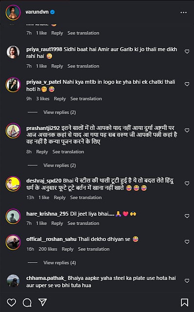 Reacting to the crack in Varun's plate, a user commented, "Par Varun bhai kya aam logon ke gharo ki tarah apke gharo me bhi bartan chatke huye use hote hain."
