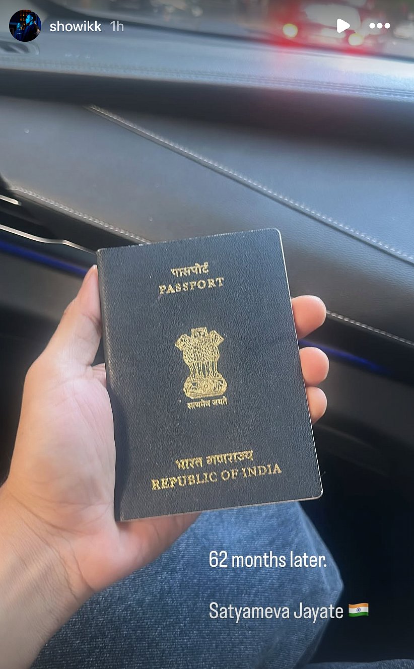Rhea's brother, Showik Chakraborty, also posted his passport with the caption, "62 months later. Satyameva Jayate."