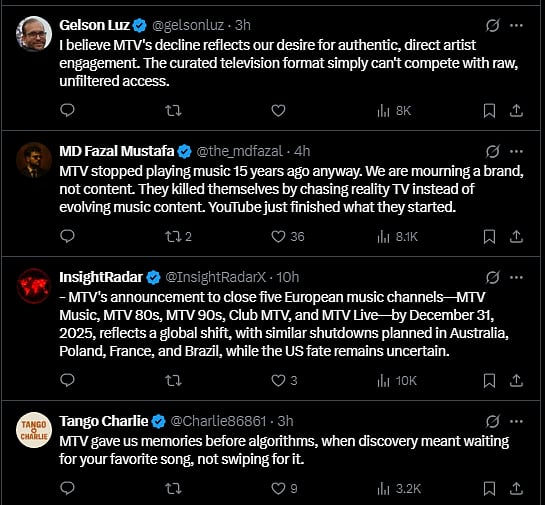 Reacting to the news, an X user wrote, "This was a long time coming, right. The original flavour of MTV was lost long ago, even in India. Clearly the market for music videos vanished with the rise of streaming music. Aside from select music videos, the channel idents on MTV are still fresh in my memory. They were so creative and showcased what magic is possible even in just 10 seconds. They made the logo iconic and took potshots at their own brand: remember the one on Tusic Melivision?"