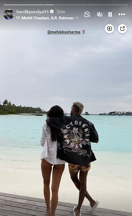 The cricketer took to his Instagram story in which he and Mahieka are seen standing close together on a deck by the beach, overlooking a serene turquoise sea.