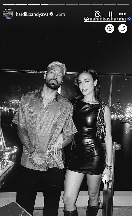 Hardik has his arm around Mahieka's shoulder as they enjoy the scenic view. The cricketer is seen wearing a printed black jacket and patterned shorts, while the actress is dressed in a white shirt.
