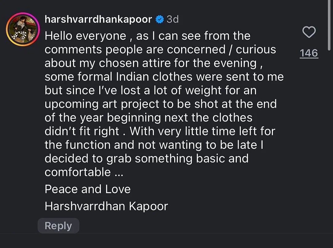 Soon after pictures from the event surfaced online, Harsh Varrdhan faced heavy trolling for his choice of attire. Responding to the criticism, the actor left a comment under one of the posts explaining the reason behind his outfit.