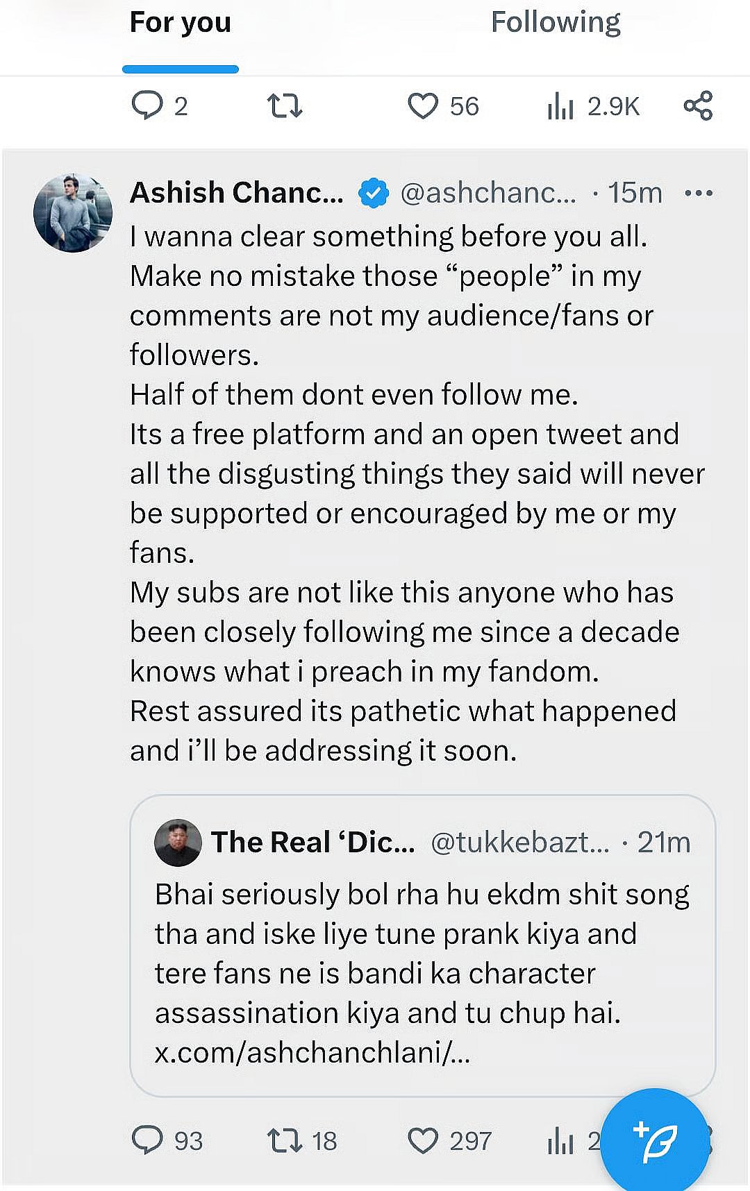Reacting to the post, Ashish wrote, "I wanna clear something before you all. Make no mistake. Those ‘people’ in my comments are not my audience/fans or followers. Half of them don’t even follow me. It’s a free platform and an open tweet, and all the disgusting things they said will never be supported or encouraged by me or my fans."