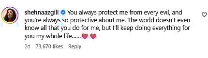 Upon hearing Shehbaz’s heartfelt confession, Shehnaaz reacted to his remarks and commented on a reel posted on his Instagram page. She wrote, "You always protect me from every evil, and you’re always so protective of me. The world doesn’t even know all that you do for me, but I’ll keep doing everything for you my whole life."