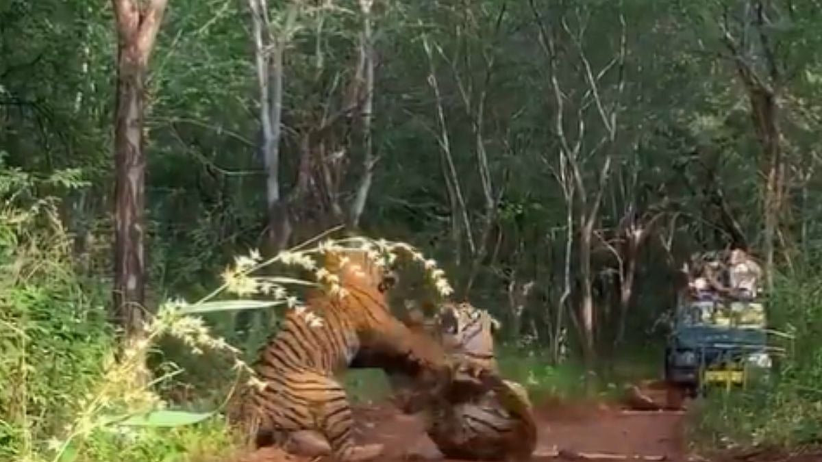Rajasthan: A rare and fierce territorial fight unfolded at the Ranthambhore Tiger Reserve on Tuesday morning, giving tourists a once-in-a-lifetime wildlife experience during their jungle safari.