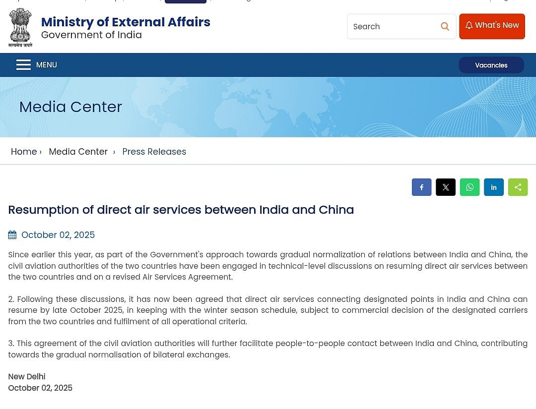 The MEA made the highly anticipated announcement on Thursday by removing the restriction on air connectivity as it permitted resumption of air services from the commencement of winter schedule that starts in late October. The civil aviation authorities of both the countries were engaging in technical-level discussions on resuming direct air services between the two countries and on a revised air services agreement (ASA). However, this move is being seen as India's approach towards gradual normalisation of relations between both the countries.