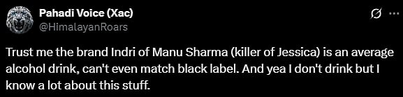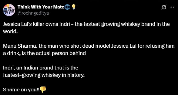 Another post read, “Jessica Lal’s killer owns Indri – the fastest growing whiskey brand in the world. Shame on you!!”
