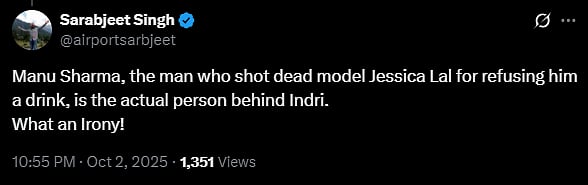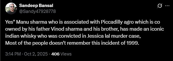 While the win was celebrated in whisky circles, social media reaction was divided. Several users expressed disbelief that the whisky’s success overshadowed its founder’s criminal past. One user wrote, “Manu Sharma, the man who shot dead model Jessica Lal for refusing him a drink, is the actual person behind Indri. What an irony!”