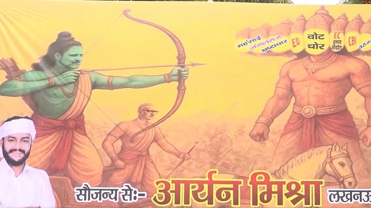 Lucknow: A hoarding outside the Uttar Pradesh Congress headquarters in Lucknow has stirred political controversy. The poster depicts Prime Minister Narendra Modi as Ravan, Congress leader Rahul Gandhi as Lord Ram, and state president Ajay Rai as Lakshman. The Ravan image carries ten heads, each labelled with issues such as inflation, unemployment, corruption, ED, CBI, EC, vote theft, paper leaks, jungle raj, and dictatorship.