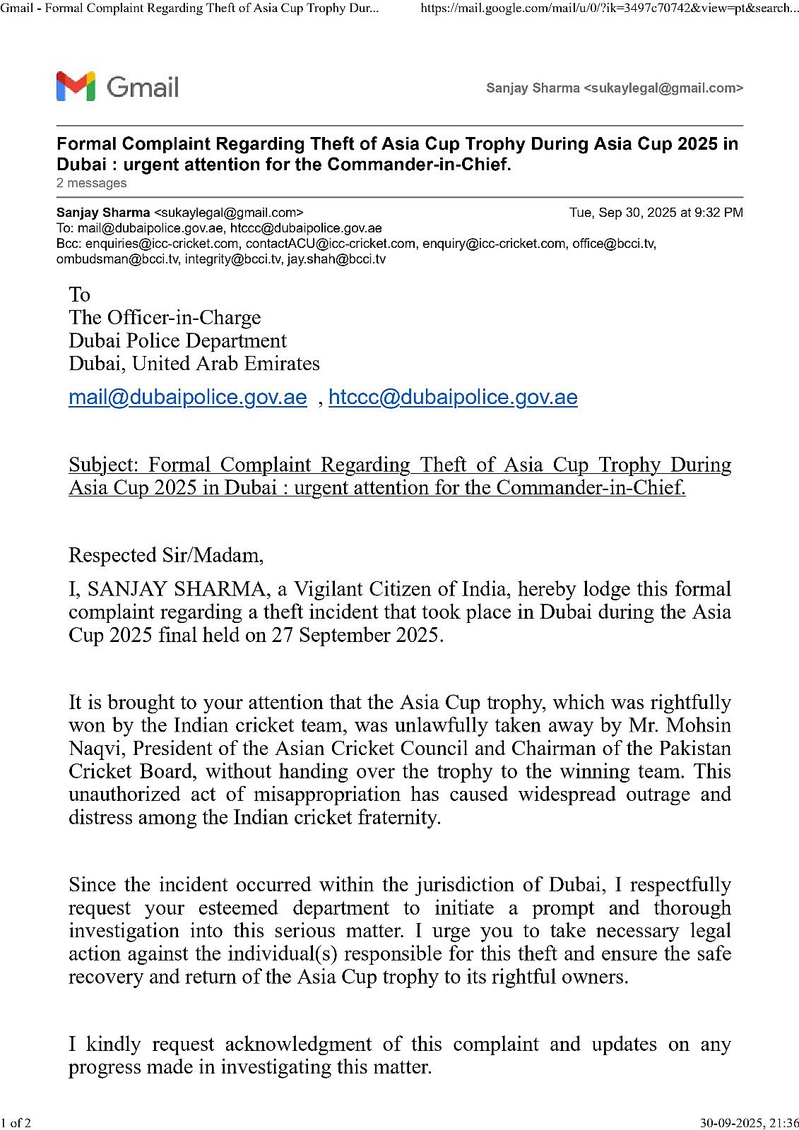 According to the complaint sent on September 30, Sharma accused Mohsin Naqvi, President of the Asian Cricket Council (ACC) and Chairman of the Pakistan Cricket Board (PCB), of unlawfully retaining the trophy instead of handing it over to the victorious Indian cricket team.