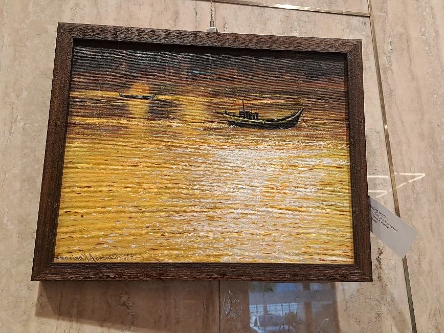 One such piece, "Last Rays of the Sun," captures boats and ships bathed in golden light as the sun sets behind the city, a view Khairnar witnessed while returning from the Elephanta Caves. "It’s not about precision," he says, "but about freezing that warm, fleeting moment."