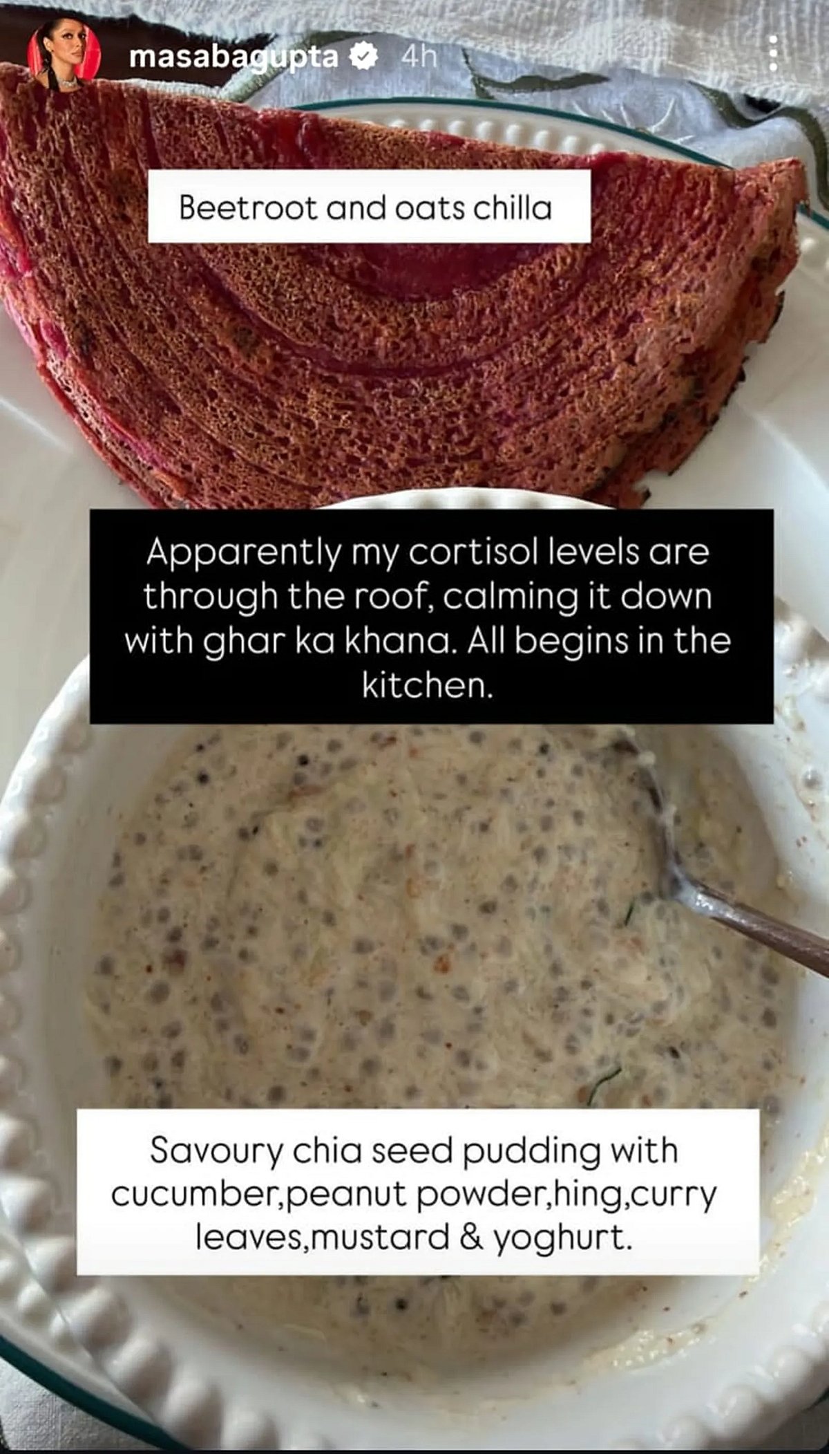 “Apparently, my cortisol levels are through the roof. Calming it down with ghar ka khaana. All begins in the kitchen,” she wrote, alongside a photo of her meal plate. Her plate featured beetroot and oats chilla, savoury chia seed pudding with cucumber, peanut powder, curry leaves, hing, mustard seeds, and yoghurt, a balanced, nutrient-rich spread aimed at healing from within.