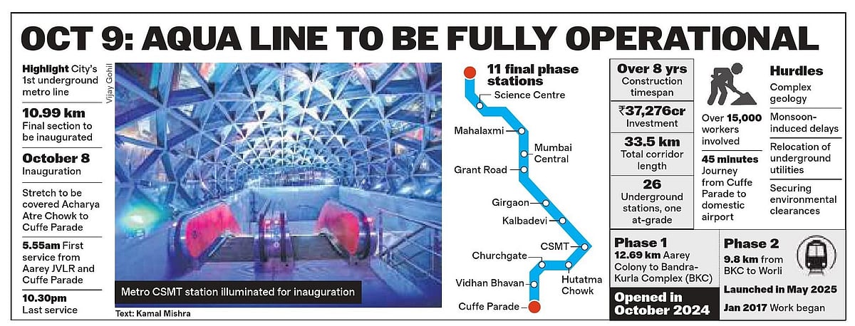Starting October 9, the Mumbai Metro Rail Corporation (MMRC) will commence operations on the entire Metro Line 3 corridor, which runs from Aarey JVLR to Cuffe Parade. The launch marks the commencement of a seamless underground metro service connecting North and South Mumbai, providing commuters across the city and its suburbs with faster and smoother travel.
