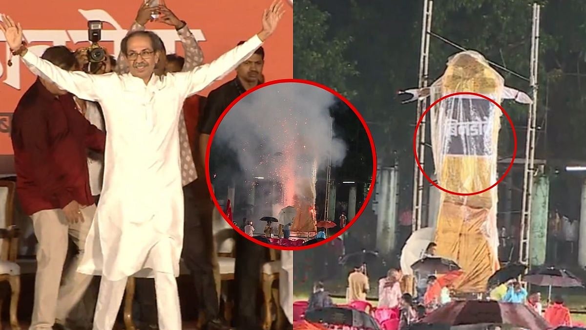 Mumbai: The annual Dussehra Melava of Shiv Sena (UBT) at Shivaji Park concluded on Thursday evening with party chief Uddhav Thackeray delivering the final speech. While the rally was held amid heavy rains that left the ground muddy and drenched thousands of supporters, the focus of the event drew attention to a symbolic centerpiece, a headless Ravan idol.