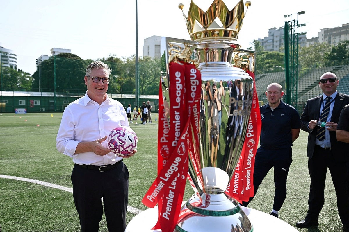 United Kingdom or British Prime Minister Keir Starmer was seen mesmerized as he looked at the the Premier League Trophy in Cooperage football ground on his visit to Mumbai. A picture of the same surfaced on social media as Starmer was holding a football on his hand and was awestruck by the Premier League Trophy.