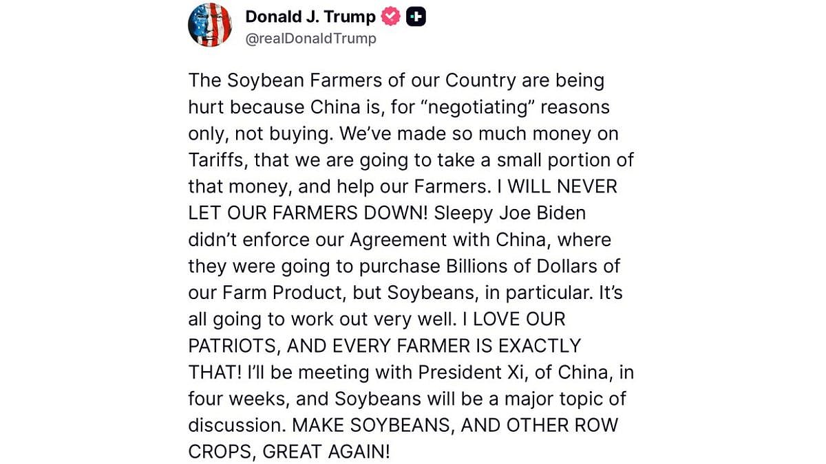 In a Truth Social post, US President Trump said, "The Soybean Farmers of our Country are being hurt because China is, for "negotiating" reasons only, not buying. We've made so much money on Tariffs, that we are going to take a small portion of that money, and help our Farmers. I WILL NEVER LET OUR FARMERS DOWN! Sleepy Joe Biden didn't enforce our Agreement with China, where they were going to purchase Billions of Dollars of our Farm Product, but Soybeans, in particular. It's all going to work out very well. I LOVE OUR PATRIOTS, AND EVERY FARMER IS EXACTLY THAT! I'll be meeting with President Xi, of China, in four weeks, and Soybeans will be a major topic of discussion. MAKE SOYBEANS, AND OTHER ROW CROPS, GREAT AGAIN!