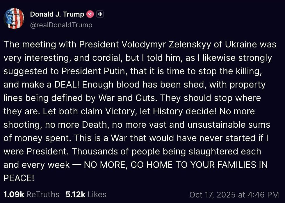 "I told him, as I likewise strongly suggested to President Putin, that it is time to stop the killing, and make a DEAL!" Trump wrote. "Enough blood has been shed, with property lines being defined by War and Guts. They should stop where they are. Let both claim Victory, let History decide!"